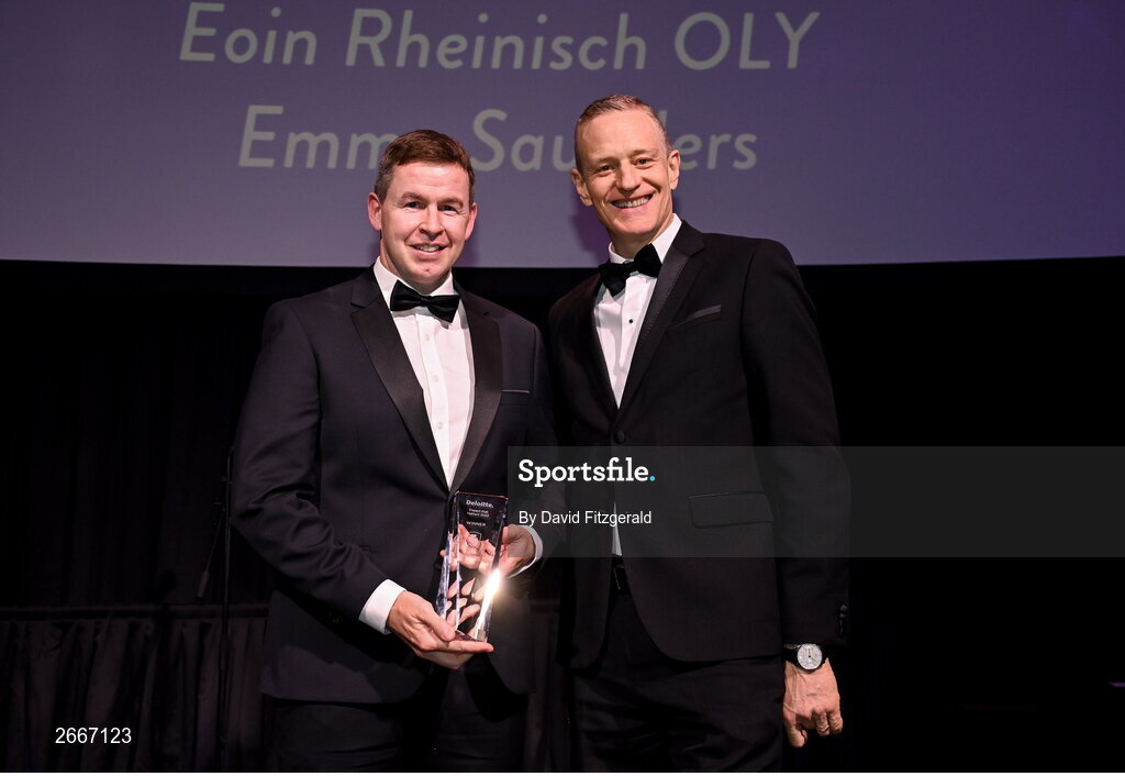 11 November 2023; Eoin Rheinisch is presented with the Deloitte Impact that Matters Award by Deloitte Ireland chief executive Harry Goddard at the Team Ireland Olympic Ball at the Mansion House in Dublin. The event was a joint celebration of the brilliant performances of Team Ireland athletes at the European Games this summer, as well as the announcement of the winners of the Olympic Federation of Ireland Annual Awards. The event was attended by the Minister for Tourism, Culture, Arts, Gaeltacht, Sport and Media, Catherine Martin TD, Minister of State for Sport and Physical Education, Thomas Byrne TD, Olympic medallists, European Games athletes, Team Ireland Sponsors and Partners, Sport Ireland and the wider Olympic family. Photo by David Fitzgerald/Sportsfile