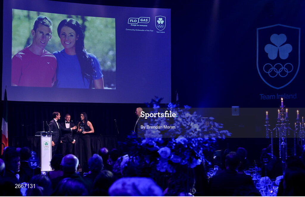 11 November 2023; Olympians Rob and Marian Heffernan are interviewd by MC Greg O'Shea after being presented with the Flogas Community Ambassador of the year award at the Team Ireland Olympic Ball at the Mansion House in Dublin. The event was a joint celebration of the brilliant performances of Team Ireland athletes at the European Games this summer, as well as the announcement of the winners of the Olympic Federation of Ireland Annual Awards. The event was attended by the Minister for Tourism, Culture, Arts, Gaeltacht, Sport and Media, Catherine Martin TD, Minister of State for Sport and Physical Education, Thomas Byrne TD, Olympic medallists, European Games athletes, Team Ireland Sponsors and Partners, Sport Ireland and the wider Olympic family. Photo by Brendan Moran/Sportsfile