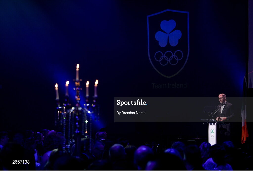 11 November 2023; Minister of State at the Department of Tourism, Culture, Arts, Gaeltacht, Sport and Media Thomas Byrne TD, speaking at the Team Ireland Olympic Ball at the Mansion House in Dublin. The event was a joint celebration of the brilliant performances of Team Ireland athletes at the European Games this summer, as well as the announcement of the winners of the Olympic Federation of Ireland Annual Awards. The event was attended by the Minister for Tourism, Culture, Arts, Gaeltacht, Sport and Media, Catherine Martin TD, Minister of State for Sport and Physical Education, Thomas Byrne TD, Olympic medallists, European Games athletes, Team Ireland Sponsors and Partners, Sport Ireland and the wider Olympic family. Photo by Brendan Moran/Sportsfile