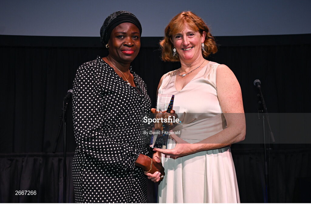 11 November 2023; Ade Adeleke, on behalf of Rhasidat Adeleke, is presented with the Sport Ireland Rising Star Award by Sport Ireland chief executive, Dr Úna May on her behalf at the Team Ireland Olympic Ball at the Mansion House in Dublin. The event was a joint celebration of the brilliant performances of Team Ireland athletes at the European Games this summer, as well as the announcement of the winners of the Olympic Federation of Ireland Annual Awards. The event was attended by the Minister for Tourism, Culture, Arts, Gaeltacht, Sport and Media, Catherine Martin TD, Minister of State for Sport and Physical Education, Thomas Byrne TD, Olympic medallists, European Games athletes, Team Ireland Sponsors and Partners, Sport Ireland and the wider Olympic family. Photo by David Fitzgerald/Sportsfile