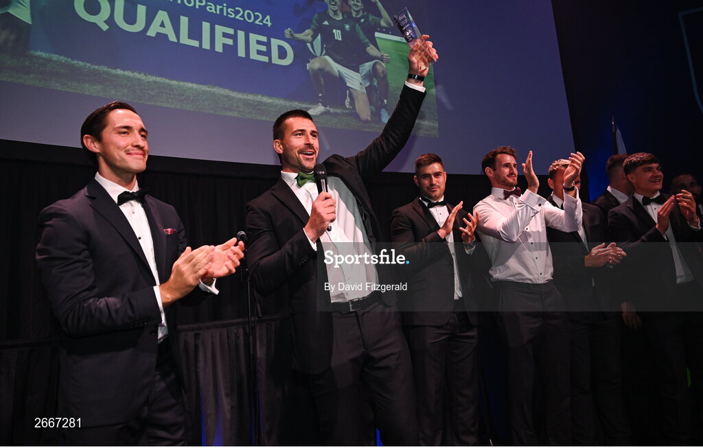 11 November 2023; Ireland rugby 7's Harry McNulty celebrates with the PTSB Team of the Year award at the Team Ireland Olympic Ball at the Mansion House in Dublin. The event was a joint celebration of the brilliant performances of Team Ireland athletes at the European Games this summer, as well as the announcement of the winners of the Olympic Federation of Ireland Annual Awards. The event was attended by the Minister for Tourism, Culture, Arts, Gaeltacht, Sport and Media, Catherine Martin TD, Minister of State for Sport and Physical Education, Thomas Byrne TD, Olympic medallists, European Games athletes, Team Ireland Sponsors and Partners, Sport Ireland and the wider Olympic family. Photo by David Fitzgerald/Sportsfile