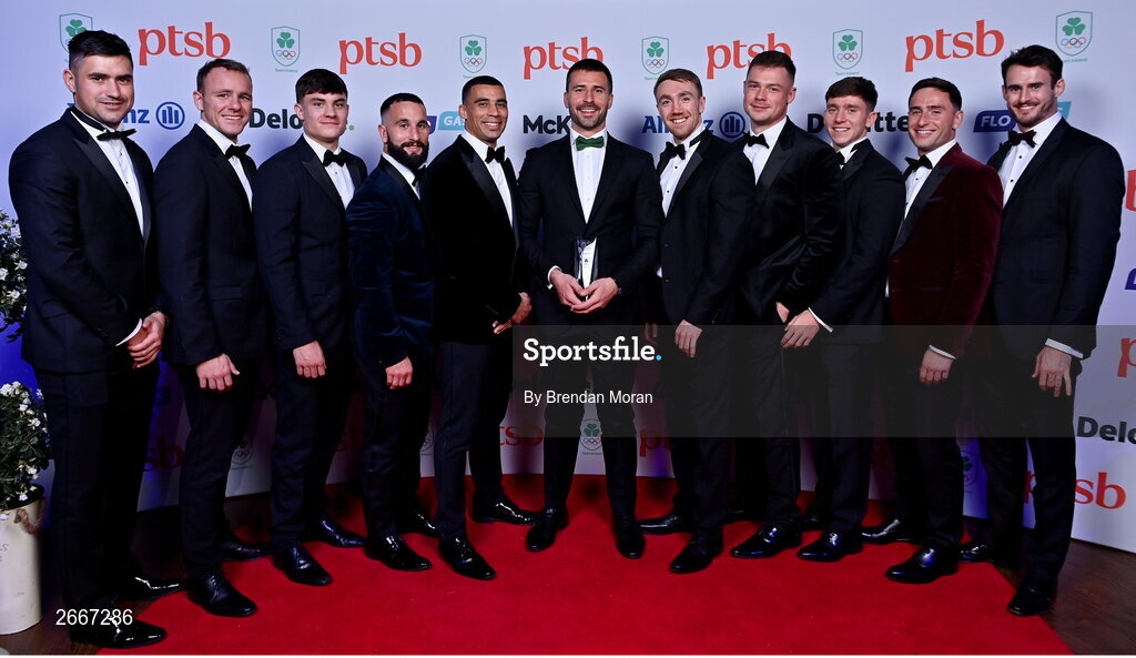 11 November 2023; The men's rugby 7s team, from left, Bryan Mollen, Niall Comerford, Dylan O'Grady, Mark Roche, Jordan Conroy, Harry McNulty, Terry Kennedy, Zac Ward, Sean Cribbin, Billy Dardis and Jack Kelly with theirr PTSB Team of the Year award at the Team Ireland Olympic Ball at the Mansion House in Dublin. The event was a joint celebration of the brilliant performances of Team Ireland athletes at the European Games this summer, as well as the announcement of the winners of the Olympic Federation of Ireland Annual Awards. The event was attended by the Minister for Tourism, Culture, Arts, Gaeltacht, Sport and Media, Catherine Martin TD, Minister of State for Sport and Physical Education, Thomas Byrne TD, Olympic medallists, European Games athletes, Team Ireland Sponsors and Partners, Sport Ireland and the wider Olympic family. Photo by Brendan Moran/Sportsfile