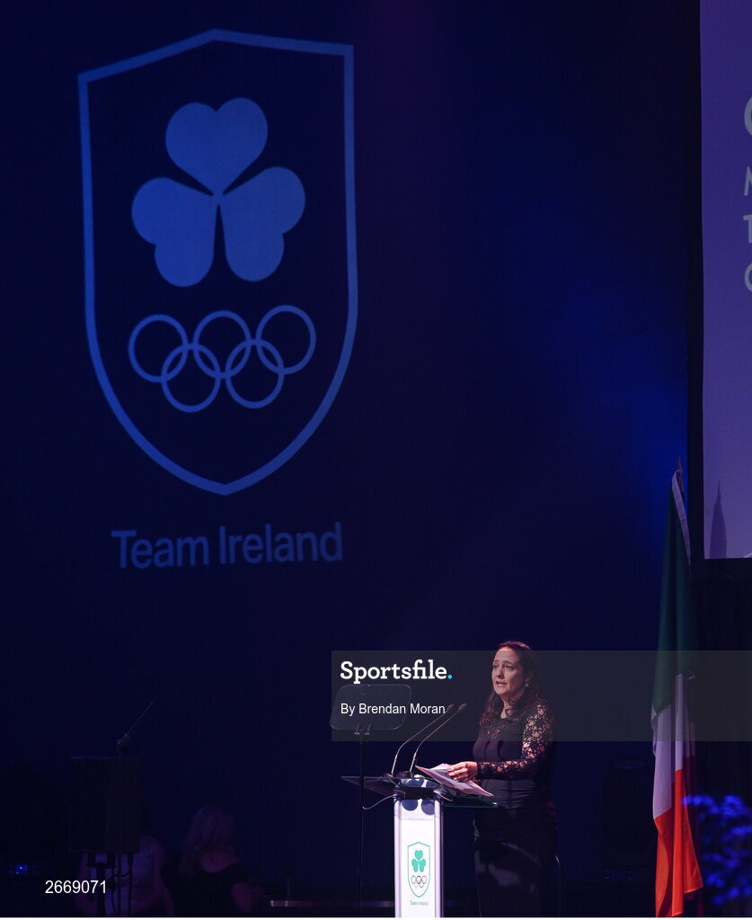 11 November 2023; Minister for Tourism, Culture, Arts, Gaeltacht, Sport and Media, Catherine Martin TD speaking at the Team Ireland Olympic Ball at the Mansion House in Dublin. The event was a joint celebration of the brilliant performances of Team Ireland athletes at the European Games this summer, as well as the announcement of the winners of the Olympic Federation of Ireland Annual Awards. The event was attended by the Minister for Tourism, Culture, Arts, Gaeltacht, Sport and Media, Catherine Martin TD, Minister of State for Sport and Physical Education, Thomas Byrne TD, Olympic medallists, European Games athletes, Team Ireland Sponsors and Partners, Sport Ireland and the wider Olympic family. Photo by Brendan Moran/Sportsfile