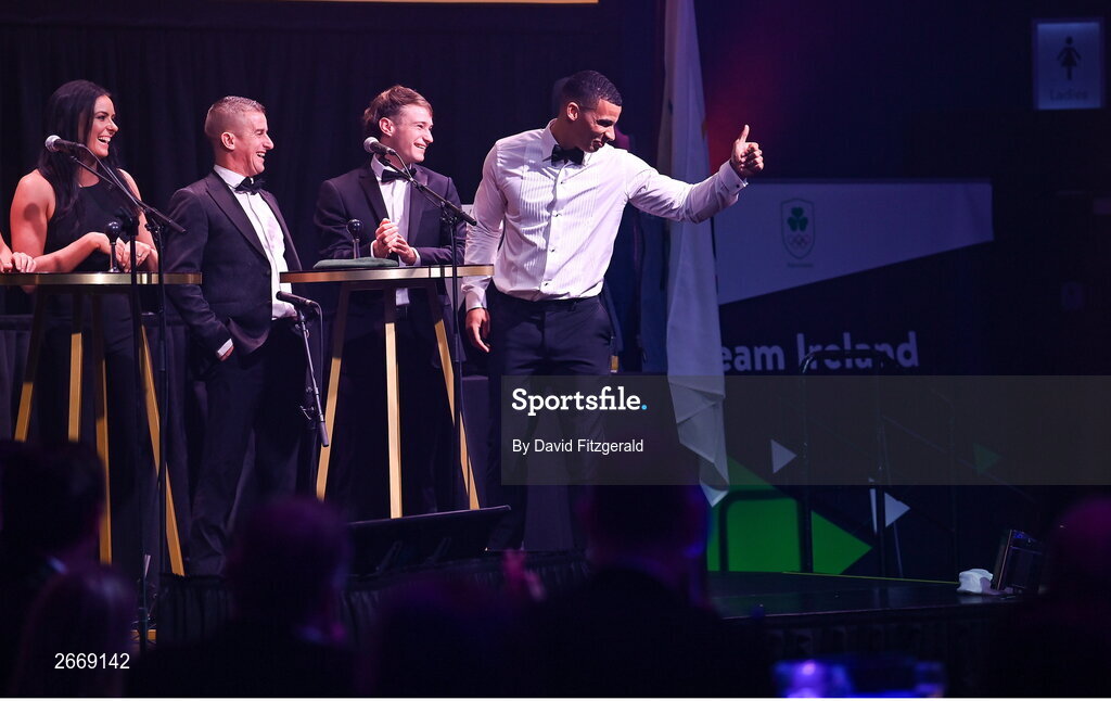 11 November 2023; Jordan Conroy, right, on stage at the Team Ireland Olympic Ball at the Mansion House in Dublin. The event was a joint celebration of the brilliant performances of Team Ireland athletes at the European Games this summer, as well as the announcement of the winners of the Olympic Federation of Ireland Annual Awards. The event was attended by the Minister for Tourism, Culture, Arts, Gaeltacht, Sport and Media, Catherine Martin TD, Minister of State for Sport and Physical Education, Thomas Byrne TD, Olympic medallists, European Games athletes, Team Ireland Sponsors and Partners, Sport Ireland and the wider Olympic family. Photo by David Fitzgerald/Sportsfile