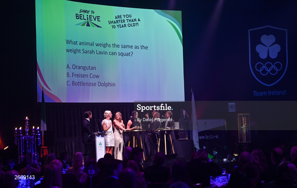 11 November 2023; Attendees, from left, MC Greg O'Shea, Sarah Lavin, Erin King, Marian Heffernan, Rob Heffernan, and Noel Hendricks on stage at the Team Ireland Olympic Ball at the Mansion House in Dublin. The event was a joint celebration of the brilliant performances of Team Ireland athletes at the European Games this summer, as well as the announcement of the winners of the Olympic Federation of Ireland Annual Awards. The event was attended by the Minister for Tourism, Culture, Arts, Gaeltacht, Sport and Media, Catherine Martin TD, Minister of State for Sport and Physical Education, Thomas Byrne TD, Olympic medallists, European Games athletes, Team Ireland Sponsors and Partners, Sport Ireland and the wider Olympic family. Photo by David Fitzgerald/Sportsfile