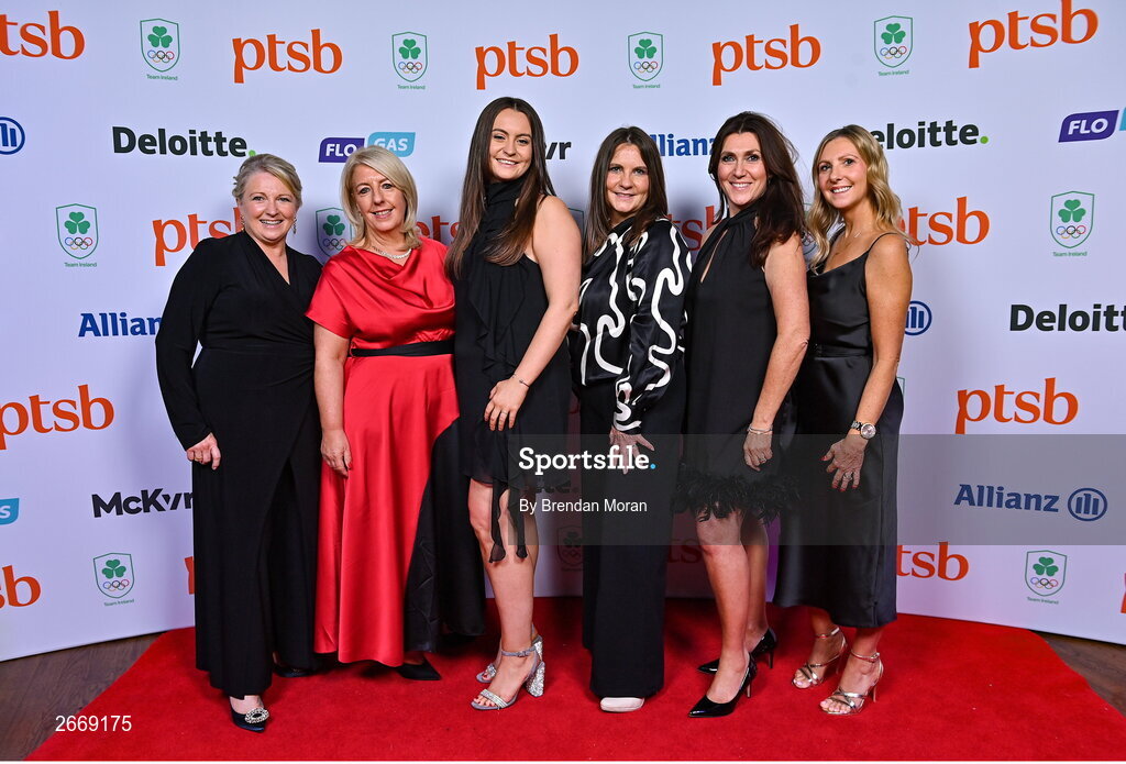 11 November 2023; Attendees, from left, Olive Loughnane, Geraldine Turley, Ciara Molloy, Kathleen Molloy, Sheila O'Brien, and Judy Lawlor in attendance at the Team Ireland Olympic Ball at the Mansion House in Dublin. The event was a joint celebration of the brilliant performances of Team Ireland athletes at the European Games this summer, as well as the announcement of the winners of the Olympic Federation of Ireland Annual Awards. The event was attended by the Minister for Tourism, Culture, Arts, Gaeltacht, Sport and Media, Catherine Martin TD, Minister of State for Sport and Physical Education, Thomas Byrne TD, Olympic medallists, European Games athletes, Team Ireland Sponsors and Partners, Sport Ireland and the wider Olympic family. Photo by Brendan Moran/Sportsfile