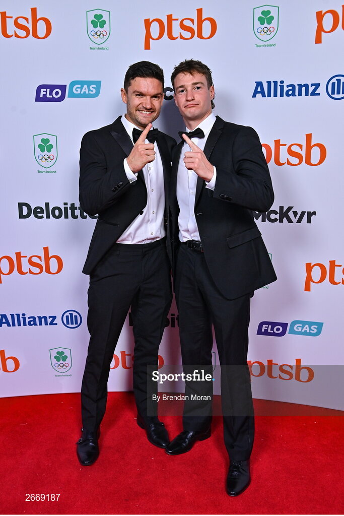 11 November 2023; Sam Curtis, left, and Noel Hendrick in attendance at the Team Ireland Olympic Ball at the Mansion House in Dublin. The event was a joint celebration of the brilliant performances of Team Ireland athletes at the European Games this summer, as well as the announcement of the winners of the Olympic Federation of Ireland Annual Awards. The event was attended by the Minister for Tourism, Culture, Arts, Gaeltacht, Sport and Media, Catherine Martin TD, Minister of State for Sport and Physical Education, Thomas Byrne TD, Olympic medallists, European Games athletes, Team Ireland Sponsors and Partners, Sport Ireland and the wider Olympic family. Photo by Brendan Moran/Sportsfile