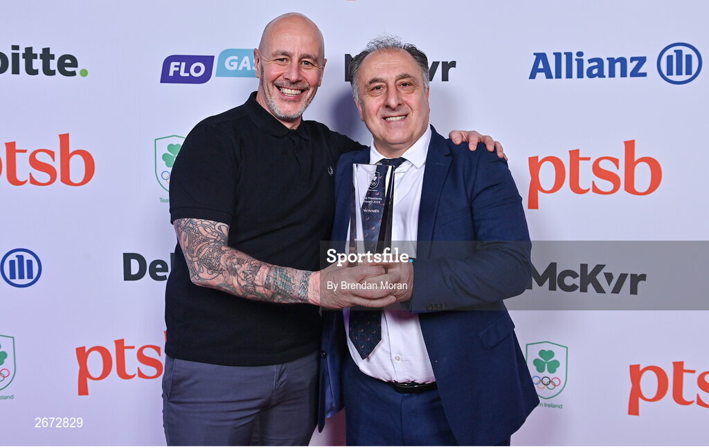 11 November 2023; President's award winner and Ireland boxing head coach Zaur Antia with boxing coach Damian Kennedy, left, at the Team Ireland Olympic Ball at the Mansion House in Dublin. The event was a joint celebration of the brilliant performances of Team Ireland athletes at the European Games this summer, as well as the announcement of the winners of the Olympic Federation of Ireland Annual Awards. The event was attended by the Minister for Tourism, Culture, Arts, Gaeltacht, Sport and Media, Catherine Martin TD, Minister of State for Sport and Physical Education, Thomas Byrne TD, Olympic medallists, European Games athletes, Team Ireland Sponsors and Partners, Sport Ireland and the wider Olympic family. Photo by Brendan Moran/Sportsfile