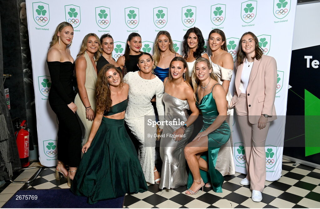 11 November 2023; The Women's Rugby 7s team in attendance at the Team Ireland Olympic Ball at the Mansion House in Dublin. The event was a joint celebration of the brilliant performances of Team Ireland athletes at the European Games this summer, as well as the announcement of the winners of the Olympic Federation of Ireland Annual Awards. The event was attended by the Minister for Tourism, Culture, Arts, Gaeltacht, Sport and Media, Catherine Martin TD, Minister of State for Sport and Physical Education, Thomas Byrne TD, Olympic medallists, European Games athletes, Team Ireland Sponsors and Partners, Sport Ireland and the wider Olympic family. Photo by David Fitzgerald/Sportsfile