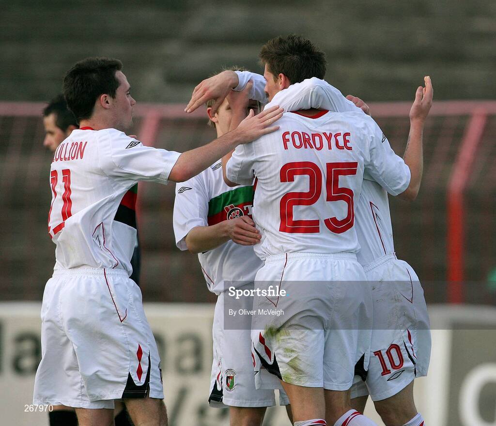 22 September 2007; Glentoran's Daryl Fordyce, 25, celebrates his goal with team-mates David Scullion, left, and Gary Hamilton. Carnegie Premier League, Glentoran v Armagh City. The Oval, Belfast, Co. Antrim. Picture credit; Oliver McVeigh / SPORTSFILE