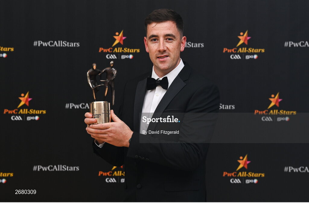17 November 2023; Diarmaid Byrnes of Limerick with his PwC GAA/GPA All-Star Award during the 2023 PwC GAA/GPA All-Star Awards at the RDS in Dublin. Photo by David Fitzgerald/Sportsfile