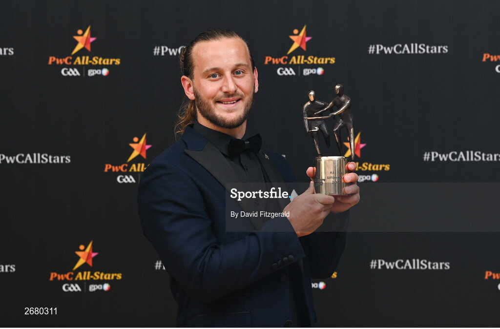 17 November 2023; Tom Morrissey of Limerick with his PwC GAA/GPA All-Star Award during the 2023 PwC GAA/GPA All-Star Awards at the RDS in Dublin. Photo by David Fitzgerald/Sportsfile