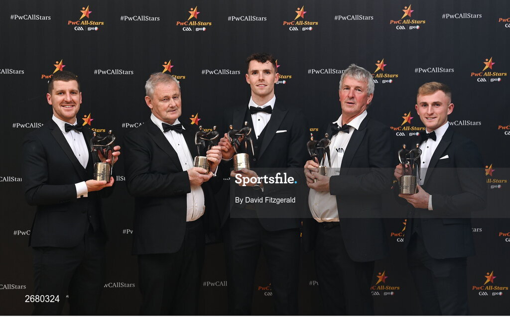 17 November 2023; Kilkenny award winners, left to right, Eoin Murphy, Sean Reid, representing his son TJ Reid, Huw Lawlor, Larry Cody, representing his son Eoin Cody, and Mikey Butler, with their PwC GAA/GPA All-Star Awards during the 2023 PwC GAA/GPA All-Star Awards at the RDS in Dublin. Photo by David Fitzgerald/Sportsfile