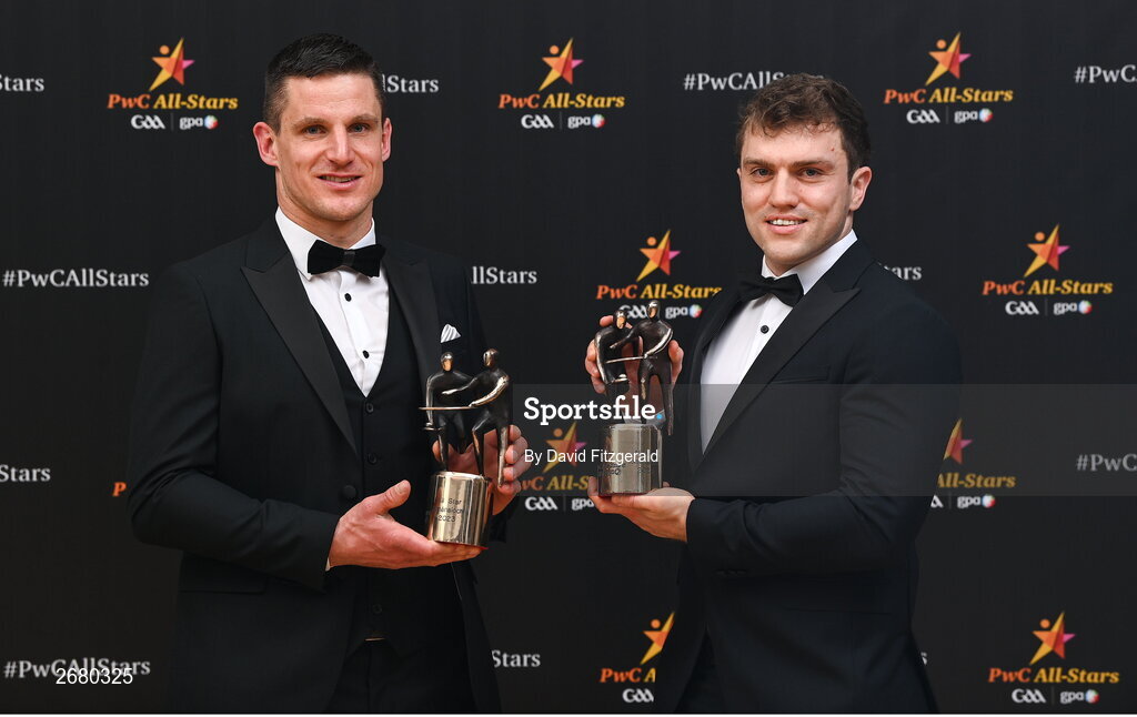17 November 2023; Clare award winners, John Conlan, left, and Shane O'Donnell, with their PwC GAA/GPA All-Star Awards during the 2023 PwC GAA/GPA All-Star Awards at the RDS in Dublin. Photo by David Fitzgerald/Sportsfile
