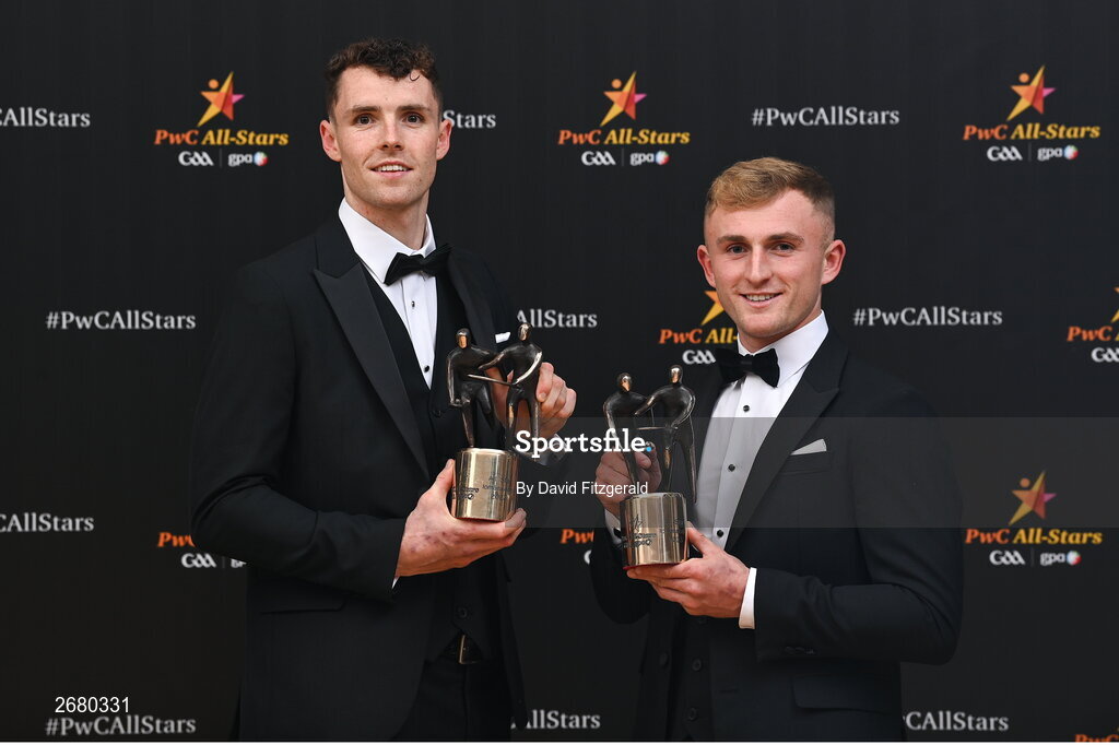 17 November 2023; Kilkenny and O'Loughlin Gaels award winners, Huw Lawlor, left, and Mikey Butler, with their PwC GAA/GPA All-Star Awards during the 2023 PwC GAA/GPA All-Star Awards at the RDS in Dublin. Photo by David Fitzgerald/Sportsfile