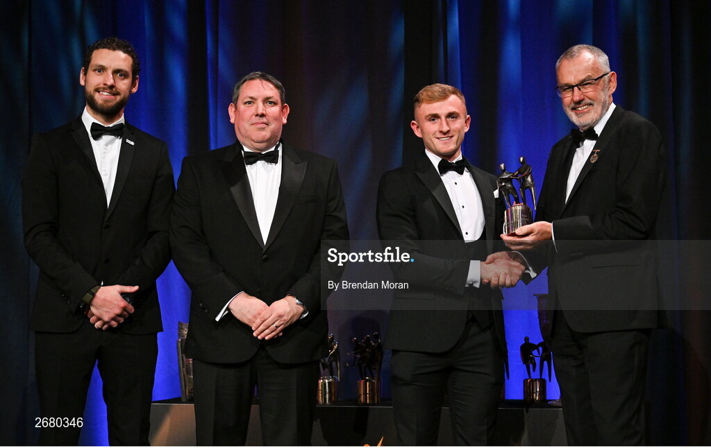 17 November 2023; Mikey Butler of Kilkenny is presented with his PwC All-Star award by Uachtarán Chumann Lúthchleas Gael Larry McCarthy, in the company of Gaelic Players Association chief executive Tom Parsons, left, and PwC managing partner Enda McDonagh during the 2023 PwC GAA/GPA All-Star Awards at the RDS in Dublin. Photo by Brendan Moran/Sportsfile