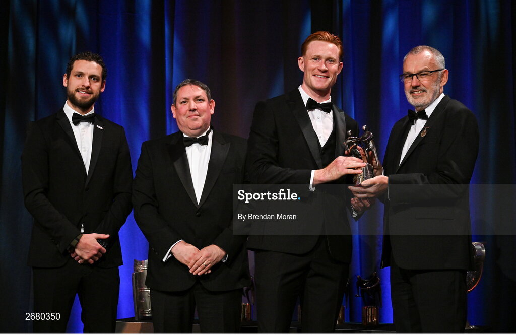 17 November 2023; William O'Donoghue of Limerick is presented with his PwC All-Star award by Uachtarán Chumann Lúthchleas Gael Larry McCarthy, in the company of Gaelic Players Association chief executive Tom Parsons, left, and PwC managing partner Enda McDonagh during the 2023 PwC GAA/GPA All-Star Awards at the RDS in Dublin. Photo by Brendan Moran/Sportsfile