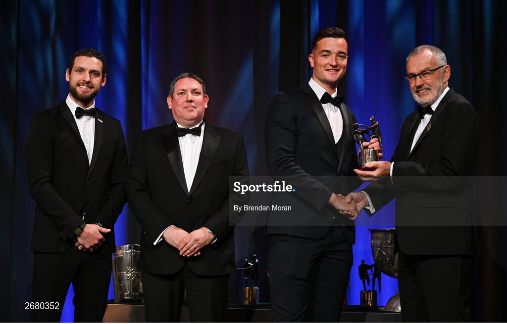 17 November 2023; Kyle Hayes of Limerick is presented with his PwC All-Star award by Uachtarán Chumann Lúthchleas Gael Larry McCarthy, in the company of Gaelic Players Association chief executive Tom Parsons, left, and PwC managing partner Enda McDonagh during the 2023 PwC GAA/GPA All-Star Awards at the RDS in Dublin. Photo by Brendan Moran/Sportsfile