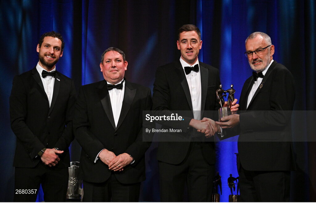 17 November 2023; Diarmaid Byrnes of Limerick is presented with his PwC All-Star award by Uachtarán Chumann Lúthchleas Gael Larry McCarthy, in the company of Gaelic Players Association chief executive Tom Parsons, left, and PwC managing partner Enda McDonagh during the 2023 PwC GAA/GPA All-Star Awards at the RDS in Dublin. Photo by Brendan Moran/Sportsfile