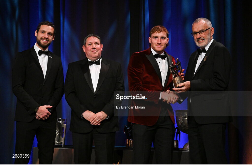 17 November 2023; Conor Whelan of Galway is presented with his PwC All-Star award by Uachtarán Chumann Lúthchleas Gael Larry McCarthy, in the company of Gaelic Players Association chief executive Tom Parsons, left, and PwC managing partner Enda McDonagh during the 2023 PwC GAA/GPA All-Star Awards at the RDS in Dublin. Photo by Brendan Moran/Sportsfile
