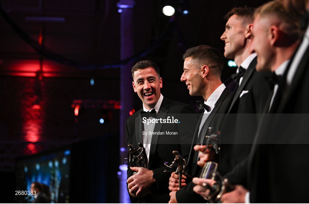 17 November 2023; Limerick players Diarmaid Byrnes and Dan Morrissey with their PwC GAA/GPA All-Star awards during the 2023 PwC GAA/GPA All-Star Awards at the RDS in Dublin. Photo by Brendan Moran/Sportsfile