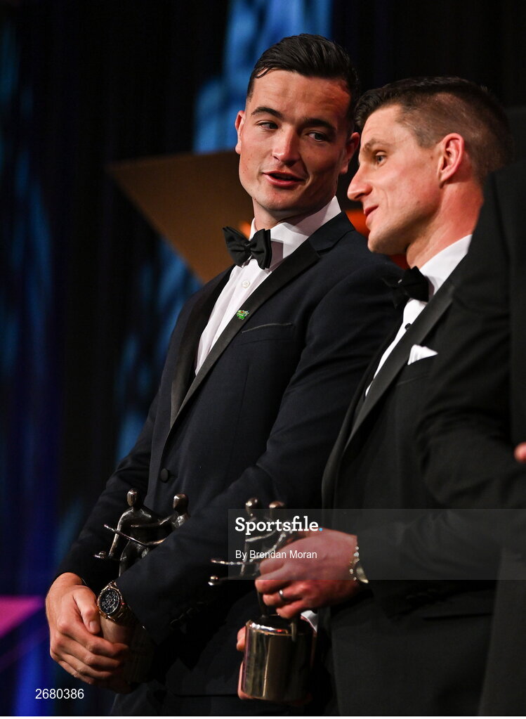 17 November 2023; Kyle Hayes of Limerick, left, and John Conlan of Clare with their PwC GAA/GPA All-Star award during the 2023 PwC GAA/GPA All-Star Awards at the RDS in Dublin. Photo by Brendan Moran/Sportsfile