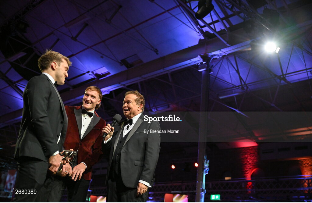 17 November 2023; Shane O'Donnell of Clare, left, and Conor Whelan of Galway are interviewd by MC Marty Morrissey during the 2023 PwC GAA/GPA All-Star Awards at the RDS in Dublin. Photo by Brendan Moran/Sportsfile