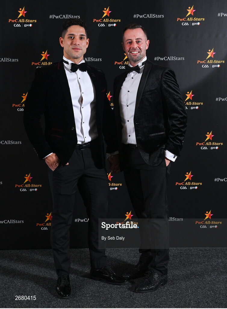 17 November 2023; Referee David Gough and Thiago Carvalho on arrival at the 2023 PwC GAA/GPA All-Star Awards at the RDS in Dublin. Photo by Seb Daly/Sportsfile