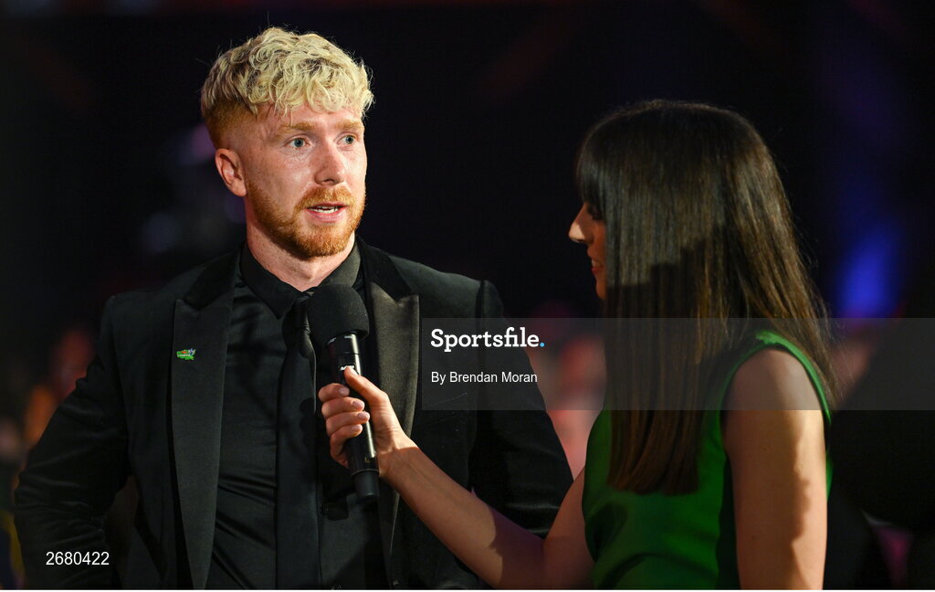 17 November 2023; Cian Lynch of Limerick is interviewed by MC Joanne Cantwell during the 2023 PwC GAA/GPA All-Star Awards at the RDS in Dublin. Photo by Brendan Moran/Sportsfile
