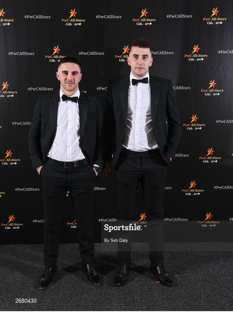 17 November 2023; Evan Niland and Brian Concannon of Galway on arrival at the 2023 PwC GAA/GPA All-Star Awards at the RDS in Dublin. Photo by Seb Daly/Sportsfile