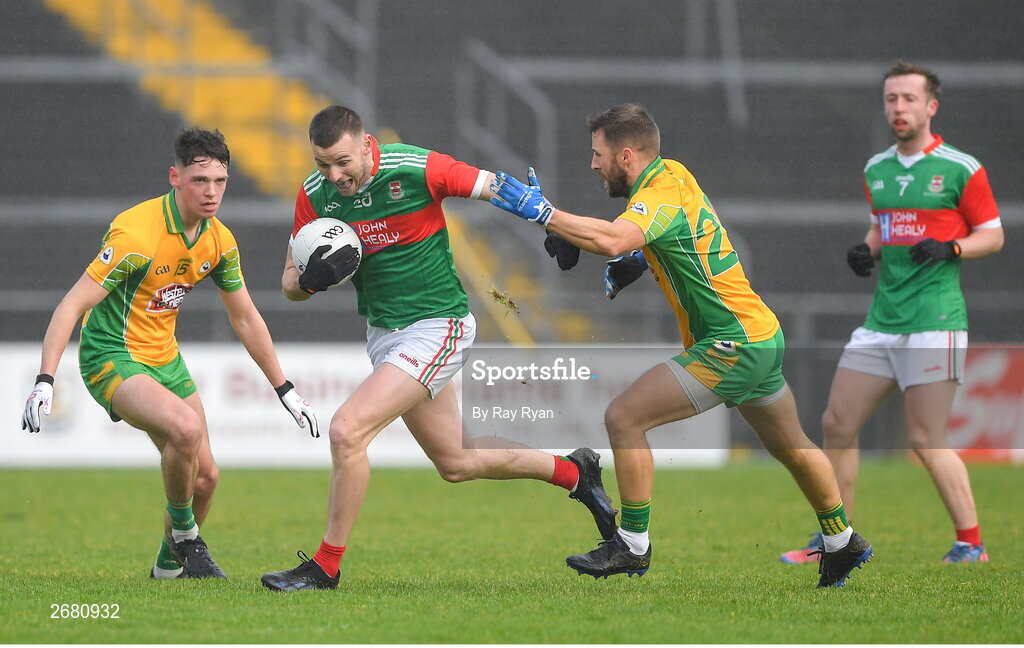 18 November 2023; Jack Irwin of Ballina Stephenites in action against Michael Lundy and Jack McCabe of Corofin during the AIB Connacht GAA Football Senior Club Championship Semi-Final match between Corofin, Galway, and Ballina Stephenites, Mayo, at Pearse Stadium, Galway. Photo by Ray Ryan/Sportsfile