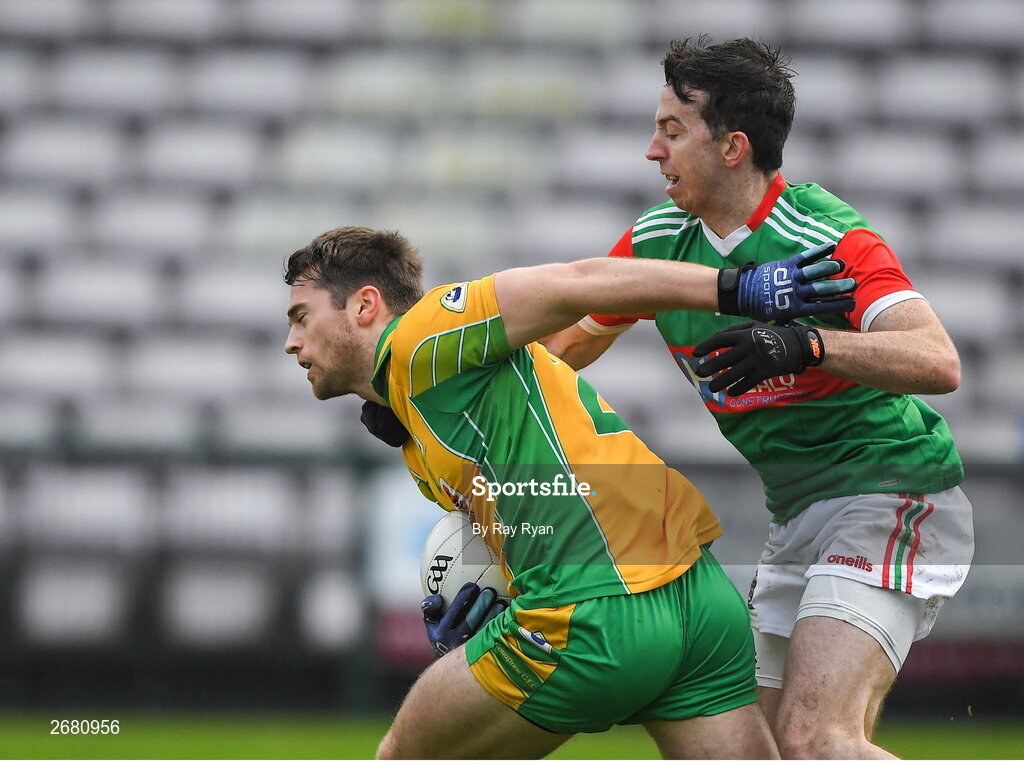18 November 2023; Liam Silke of Corofin in action against Evan Regan of Ballina Stephenites during the AIB Connacht GAA Football Senior Club Championship Semi-Final match between Corofin, Galway, and Ballina Stephenites, Mayo, at Pearse Stadium, Galway. Photo by Ray Ryan/Sportsfile