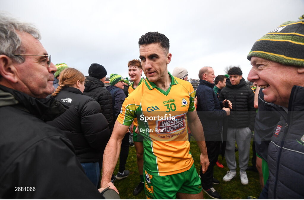 18 November 2023; Daithi Burke of Corofin is congratulated after the AIB Connacht GAA Football Senior Club Championship Semi-Final match between Corofin, Galway, and Ballina Stephenites, Mayo, at Pearse Stadium, Galway. Photo by Ray Ryan/Sportsfile