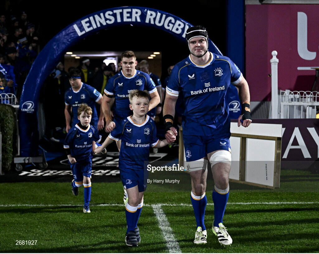 18 November 2023; Matchday mascots Elliott O'Beirne, aged eight, runs out with James Ryan of Leinster and Ryan O'Hara, aged seven, with Garry Ringrose before the United Rugby Championship match between Leinster and Scarlets at the RDS Arena in Dublin. Photo by Harry Murphy/Sportsfile