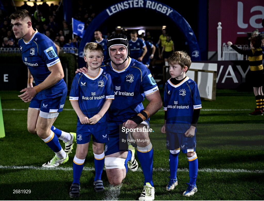 18 November 2023; Matchday mascots Elliott O'Beirne, aged eight, and Ryan O'Hara, aged seven, with Leinster co-captains James Ryan and Garry Ringrose before the United Rugby Championship match between Leinster and Scarlets at the RDS Arena in Dublin. Photo by Harry Murphy/Sportsfile