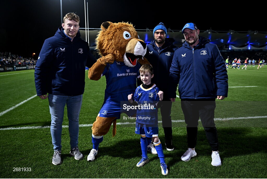18 November 2023; Matchday mascots Ryan O'Hara, aged seven, with Leinster players Martin Moloney, Ed Byrne and Charlie Ngatai and Leo the Lion before the United Rugby Championship match between Leinster and Scarlets at the RDS Arena in Dublin. Photo by Harry Murphy/Sportsfile