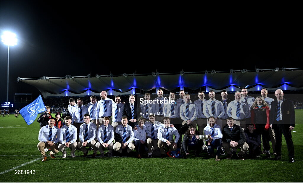 18 November 2023; The Leinster Junior interpro team with their trophy at half-time in United Rugby Championship match between Leinster and Scarlets at the RDS Arena in Dublin. Photo by Harry Murphy/Sportsfile