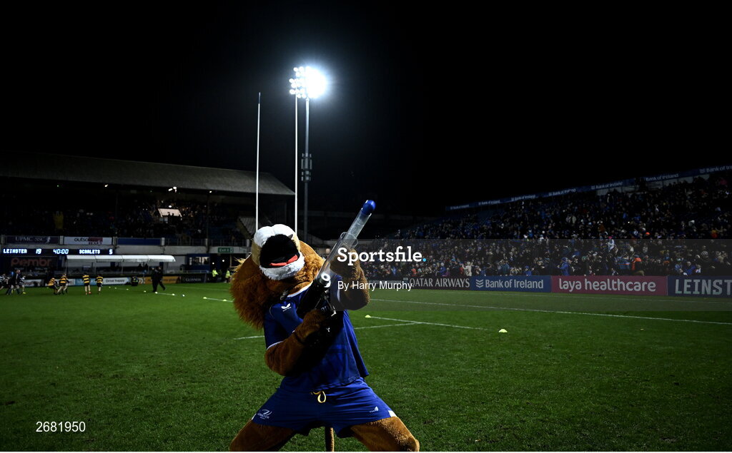 18 November 2023; Leinster mascot Leo the Lion with the Castore Cannon at half-time in United Rugby Championship match between Leinster and Scarlets at the RDS Arena in Dublin. Photo by Harry Murphy/Sportsfile