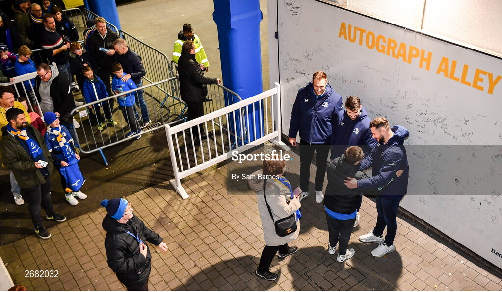 18 November 2023; Leinster players Jason Jenkins, Harry Byrne and Robbie Henshaw with supporters in Autograph Alley before the United Rugby Championship match between Leinster and Scarlets at the RDS Arena in Dublin. Photo by Sam Barnes/Sportsfile