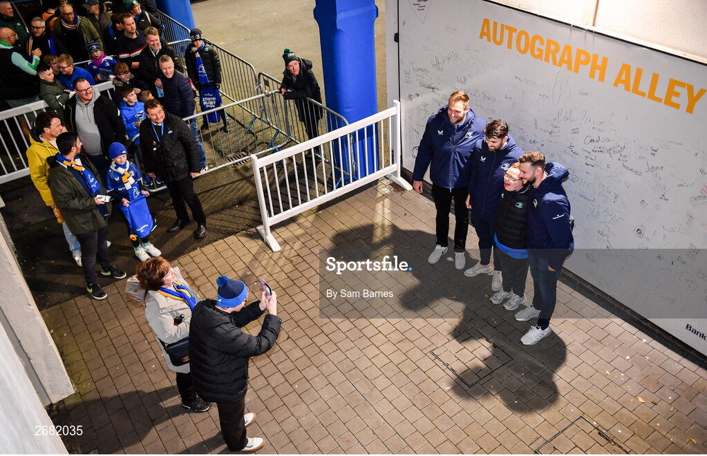 18 November 2023; Leinster players Jason Jenkins, Harry Byrne and Robbie Henshaw with supporters in Autograph Alley before the United Rugby Championship match between Leinster and Scarlets at the RDS Arena in Dublin. Photo by Sam Barnes/Sportsfile