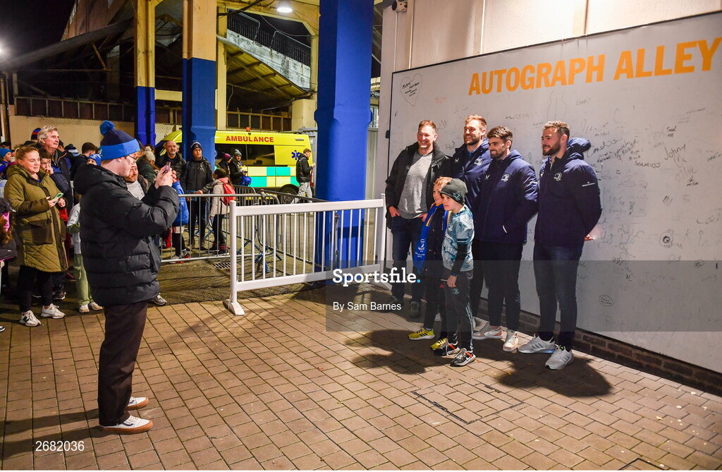 18 November 2023; Leinster players Jason Jenkins, Harry Byrne and Robbie Henshaw with supporters in Autograph Alley before the United Rugby Championship match between Leinster and Scarlets at the RDS Arena in Dublin. Photo by Sam Barnes/Sportsfile