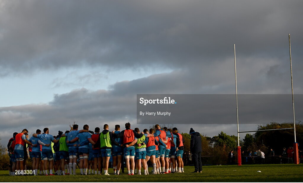20 November 2023; Leinster players huddle during a squad training session on the Leinster Rugby 12 Counties Tour at Kilkenny College in Kilkenny. Photo by Harry Murphy/Sportsfile