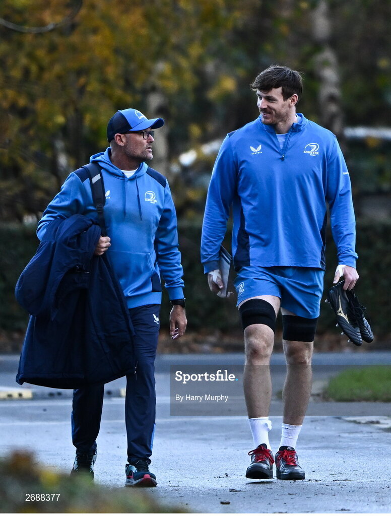 27 November 2023; Leinster senior coach Jacques Nienaber arrives alongside Ryan Baird for a Leinster Rugby squad training at UCD in Dublin. Photo by Harry Murphy/Sportsfile