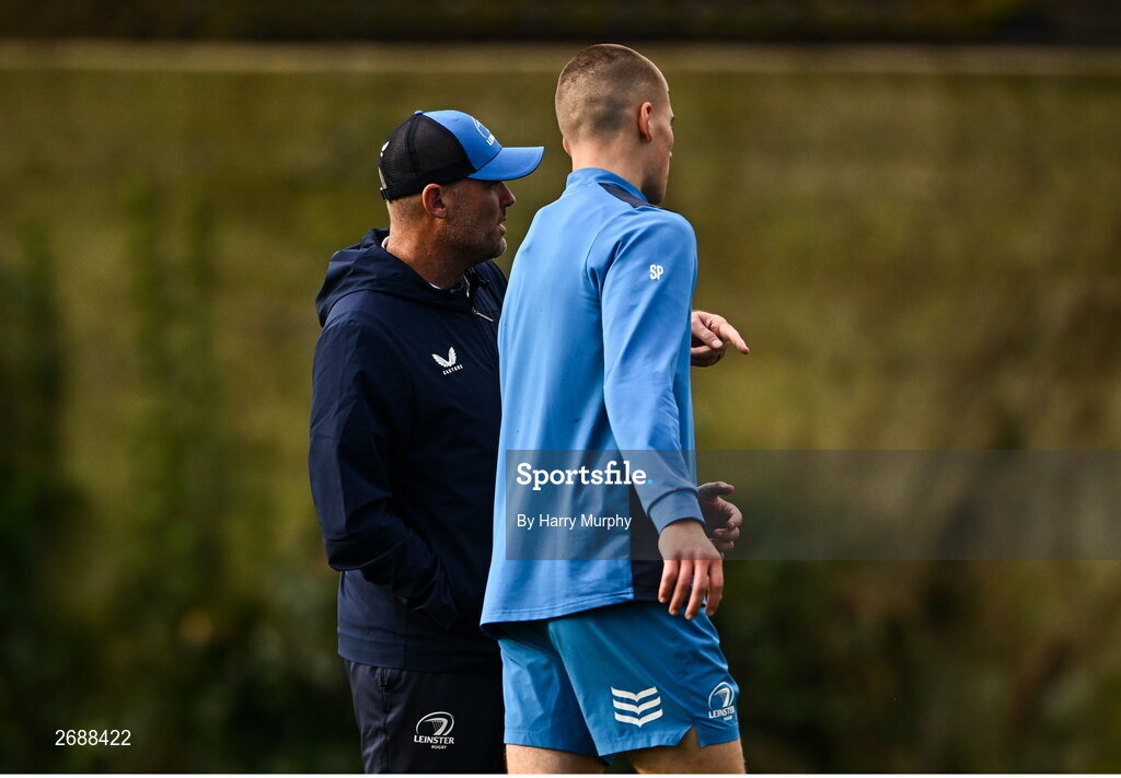27 November 2023; Leinster Senior coach Jacques Nienaber and Sam Prendergast during a Leinster Rugby squad training at UCD in Dublin. Photo by Harry Murphy/Sportsfile