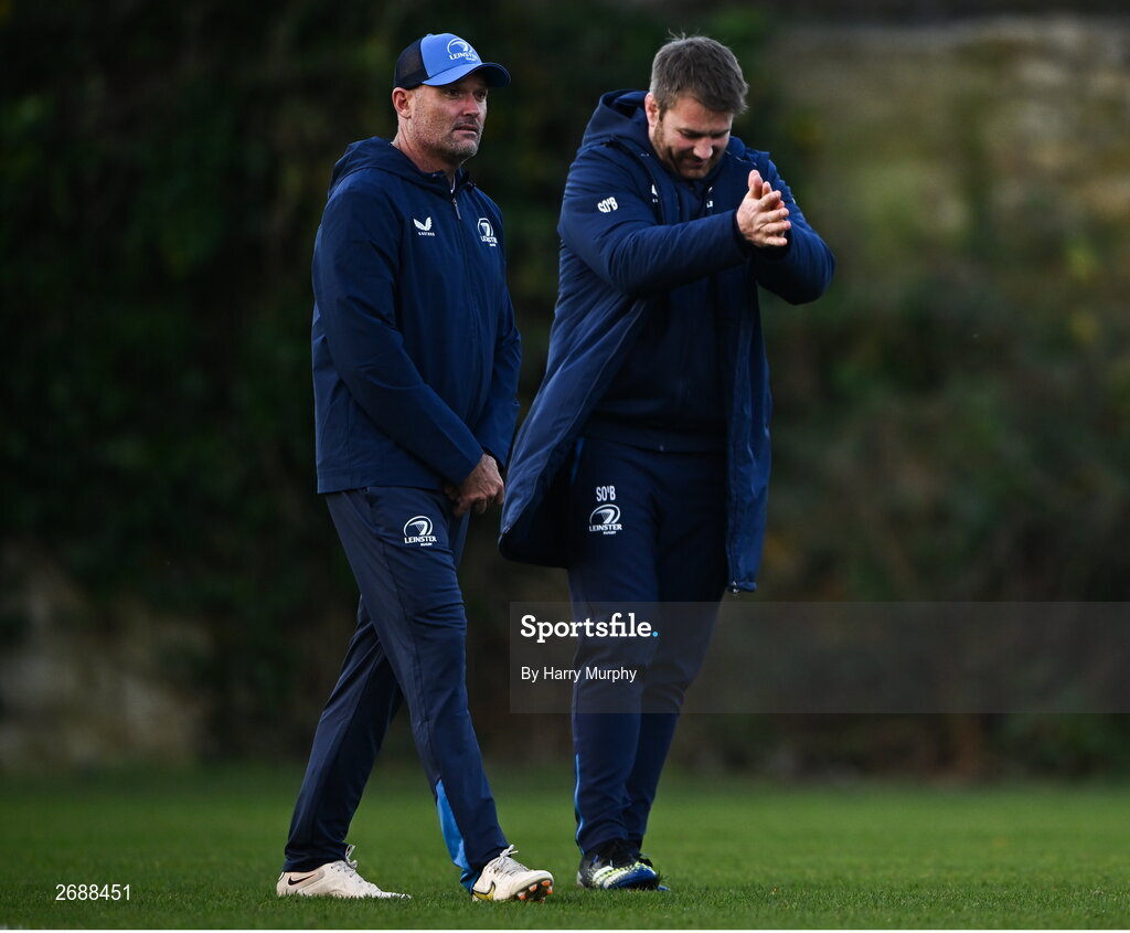 27 November 2023; Leinster senior coach Jacques Nienaber and contact skills coach Sean O'Brien during a Leinster Rugby squad training at UCD in Dublin. Photo by Harry Murphy/Sportsfile