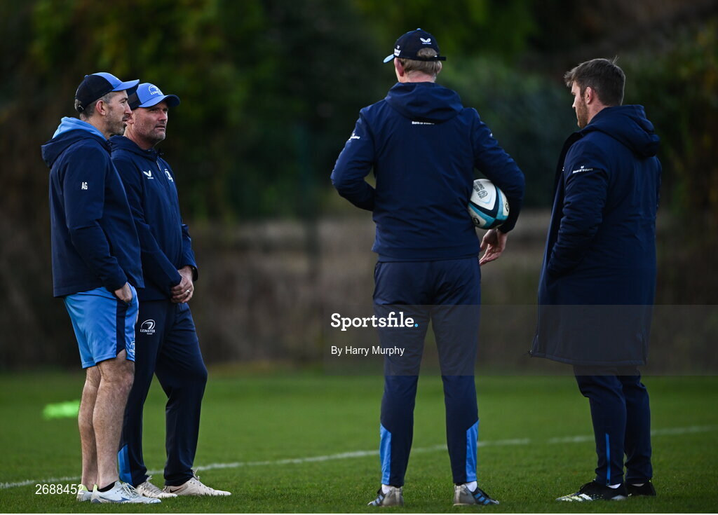 27 November 2023; Leinster coaches, from left, backs coach Andrew Goodman, senior coach Jacques Nienaber, head coach Leo Cullen and contact skills coach Sean O'Brien during a Leinster Rugby squad training at UCD in Dublin. Photo by Harry Murphy/Sportsfile