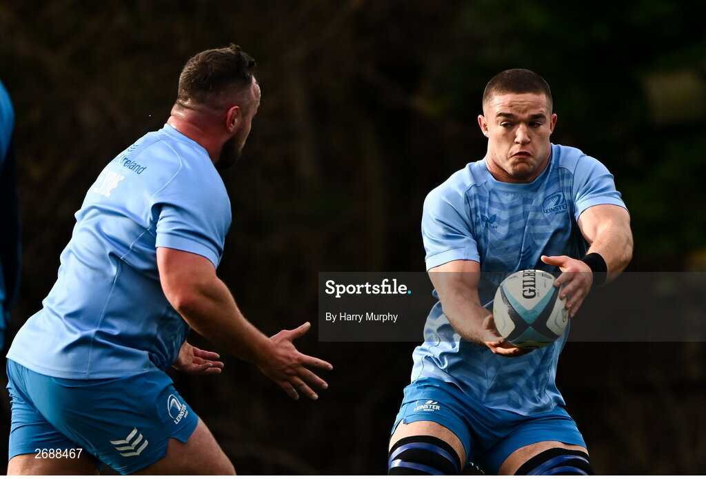 27 November 2023; Scott Penny, right, and Ed Byrne during a Leinster Rugby squad training at UCD in Dublin. Photo by Harry Murphy/Sportsfile