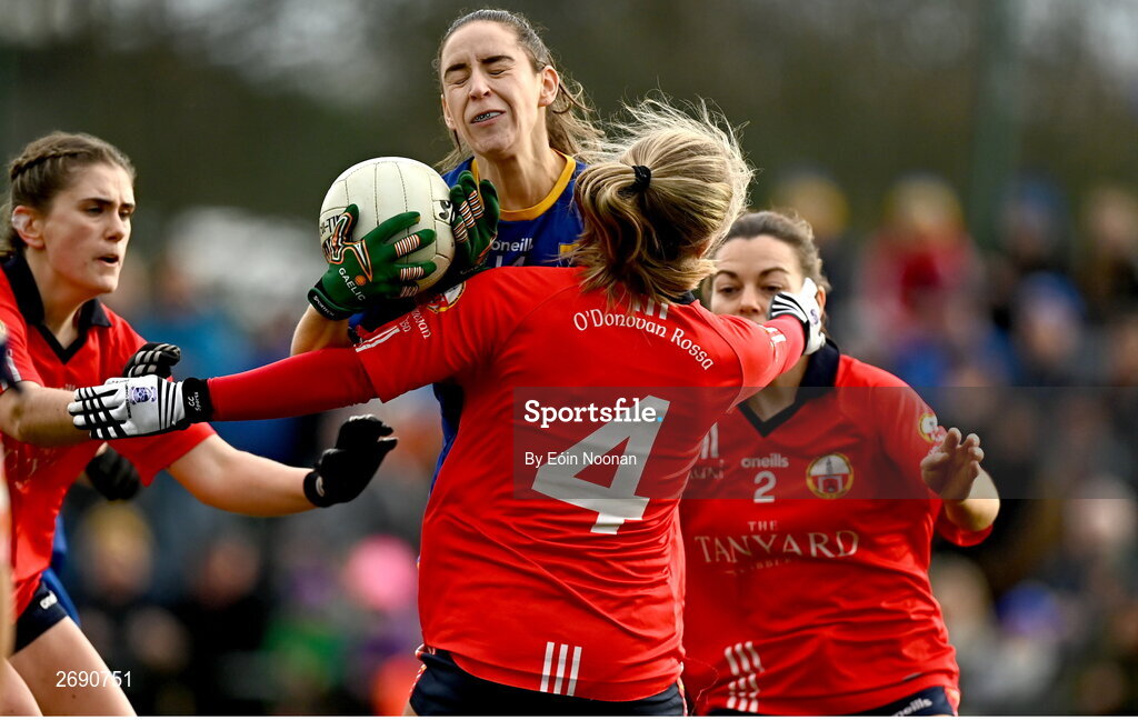 2 December 2023; Aisling Murphy of Gusserane in action against Allie Tobin of O'Donovan Rossa during the Currentaccount.ie All-Ireland Ladies Junior Club Championship semi-final match between O’Donovan Rossa of Cork and Gusserane of Wexford at O’Donovan Rossa GAA, Cork. Photo by Eóin Noonan/Sportsfile
