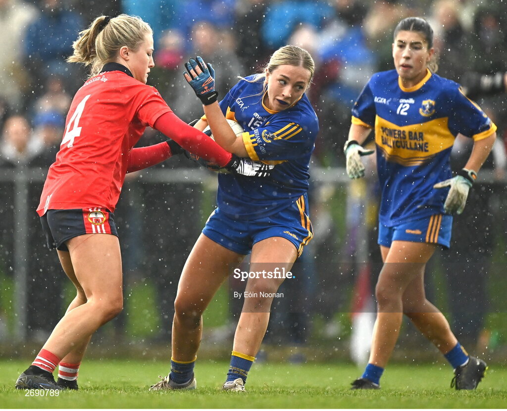 2 December 2023; Shauna Hackett of Gusserane in action against Allie Tobin of O'Donovan Rossa during the Currentaccount.ie All-Ireland Ladies Junior Club Championship semi-final match between O’Donovan Rossa of Cork and Gusserane of Wexford at O’Donovan Rossa GAA, Cork. Photo by Eóin Noonan/Sportsfile