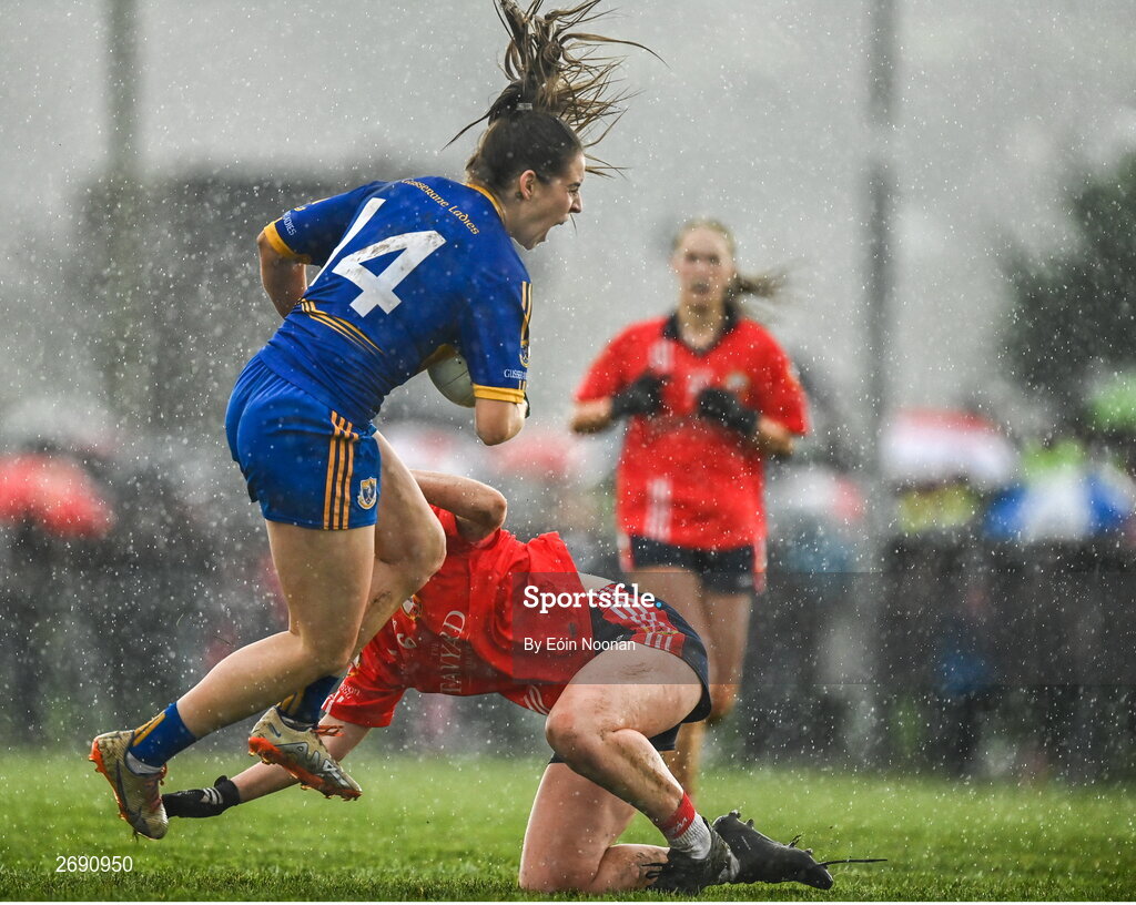 2 December 2023; Aisling Murphy of Gusserane is tackled by Sarah Hurley of O'Donovan Rossa during the Currentaccount.ie All-Ireland Ladies Junior Club Championship semi-final match between O’Donovan Rossa of Cork and Gusserane of Wexford at O’Donovan Rossa GAA, Cork. Photo by Eóin Noonan/Sportsfile